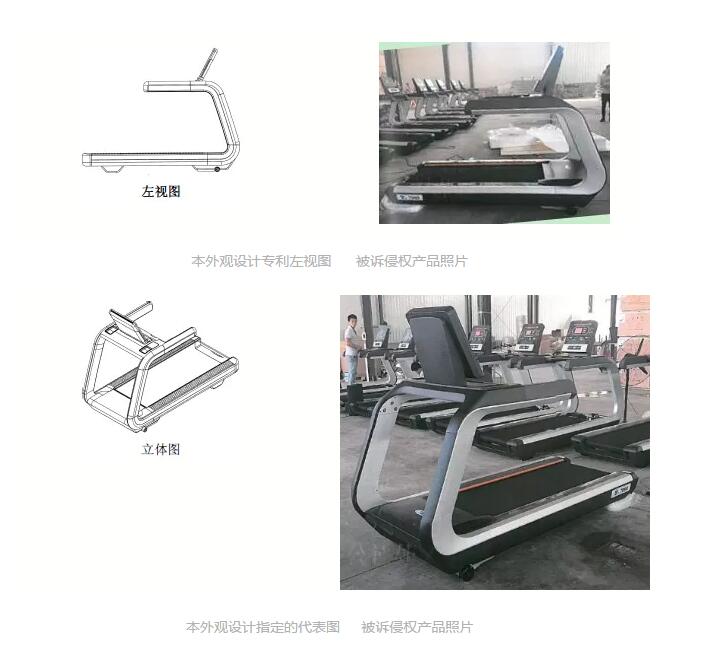 原告经调查发现,被告持有用于制造涉案侵权产品TZ-7000跑步机的专用设备、模具,并在其工厂内大量制造、组装、存储TZ-7000跑步机产品,并通过互联网大量销售及许诺销售上述侵权产品。鉴于此,原告泰诺健公司于2016年7月将被告天展公司诉至济南中院,请求判令被告停止侵权行为,即停止制造、许诺销售、销售侵犯原告外观设计专利权的跑步机产品,并赔偿原告实际损失人民币100万元及合理维权费用20万元。被控侵权跑步机产品与涉案专利的外观设计简单比对可参见下图: